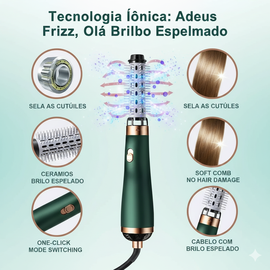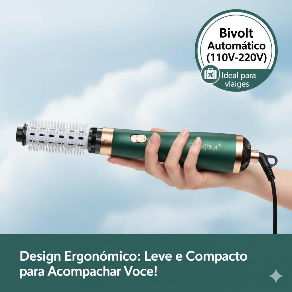 Chega de carregar vários aparelhos pesados ou perder horas tentando equilibrar secador e escova. A Air Glow 3 em 1 é a revolução que sua rotina precisava: ela é um sistema completo de estilização que cuida da saúde dos seus fios enquanto cria o visual dos seus sonhos. Do liso espelhado às ondas de cinema, o poder está nas suas mãos.