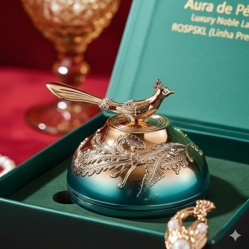 🦚 Design Magistral e Exclusivo: Embalagem ornamental com uma espátula magnética de pavão para uma aplicação higiênica e luxuosa.