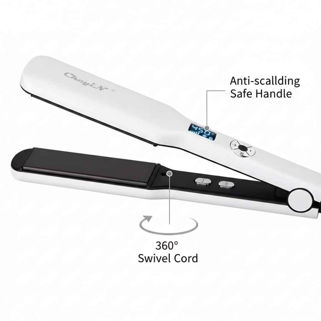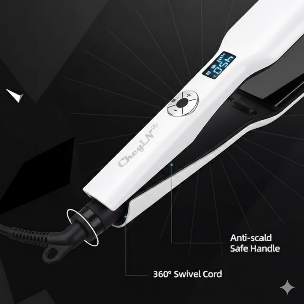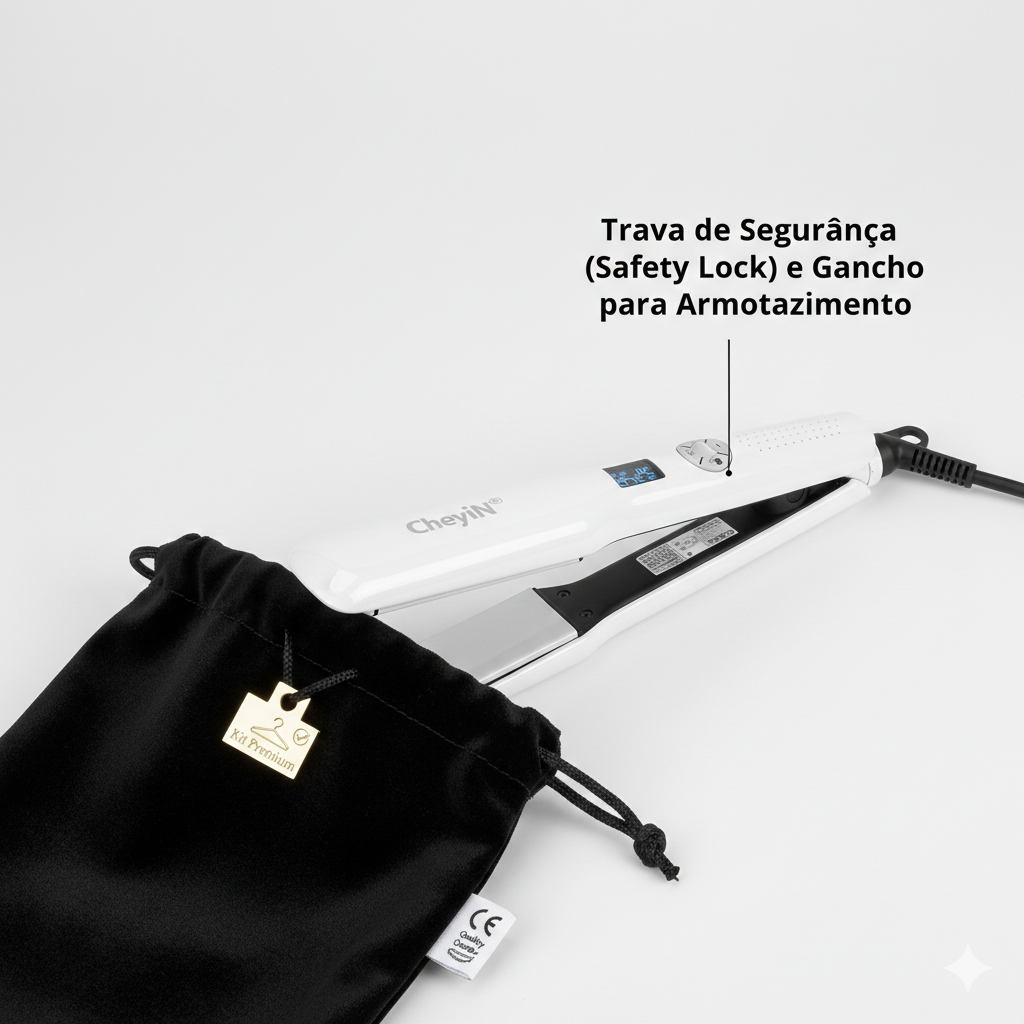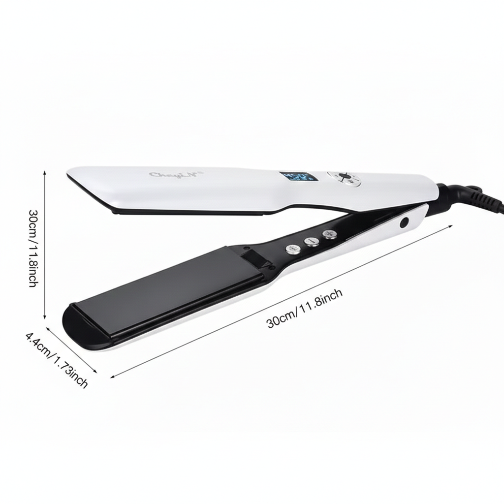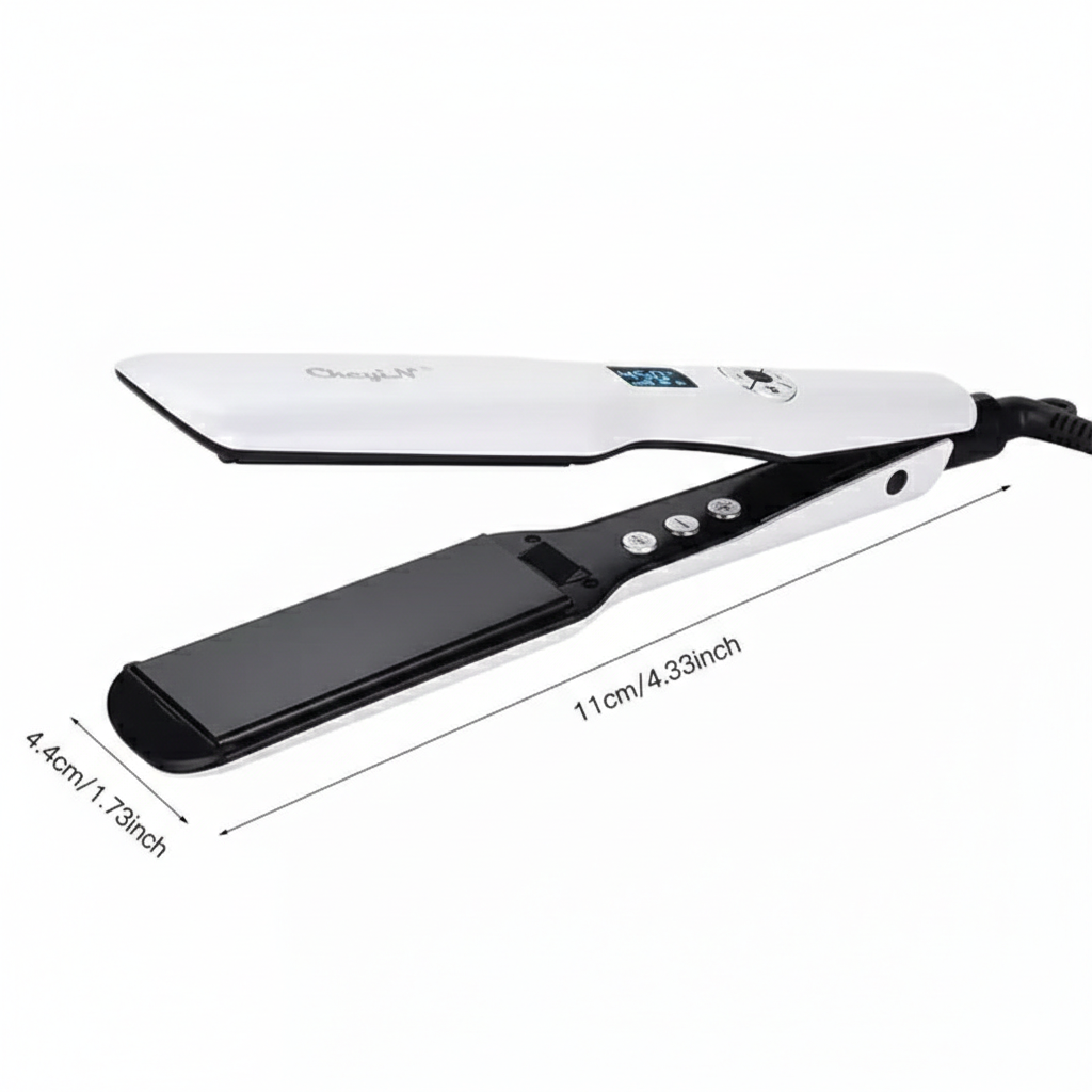 Com suas placas extra largas de 44mm, ele abrange mechas maiores de uma só vez, sendo a escolha definitiva para cabelos volumosos ou longos que buscam o brilho espelhado de salão.
