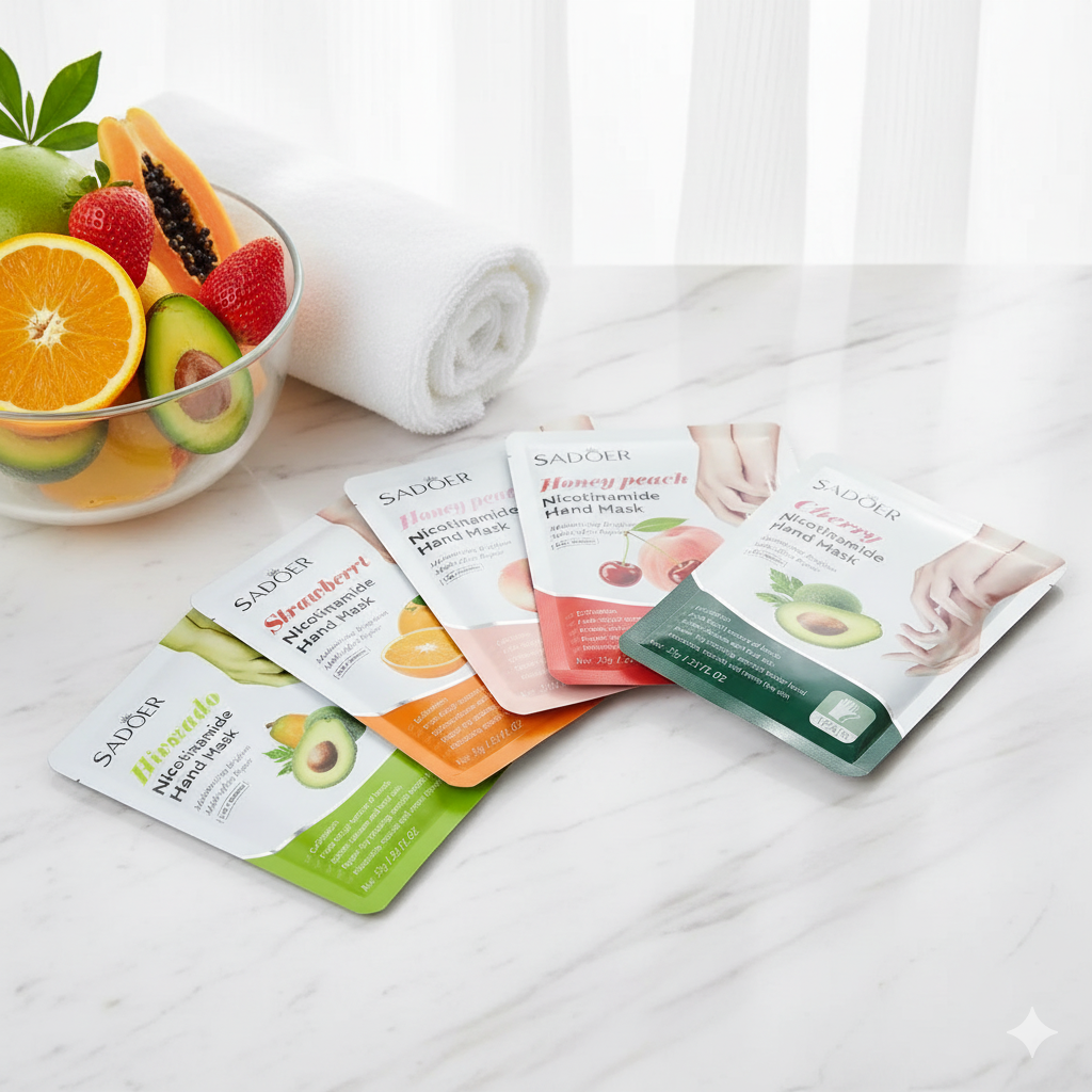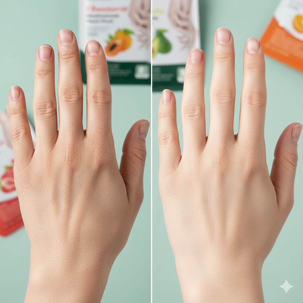Diferente de loções comuns que evaporam, o formato de luva cria um microclima que abre os poros e força a pele a absorver 100% da essência nutritiva. Enquanto a Laranja (Vitamina C) foca no brilho, o Pêssego e o Morango refinam a textura. É a combinação perfeita de antioxidantes e ácidos graxos que interrompe o envelhecimento precoce das mãos, protegendo-as contra o ressecamento do sol e produtos de limpeza.