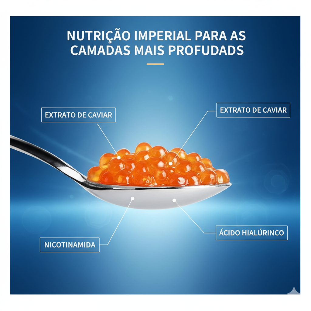 Ativos Principais: Extrato de Caviar, Ácido Hialurônico, Nicotinamida e Colágeno Hidrolisado.