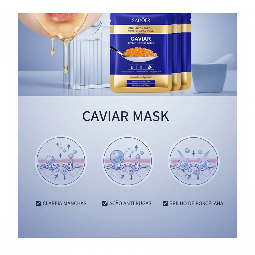 A fusão imperial de Extrato de Caviar e Ácido Hialurônico que desperta a juventude celular, suaviza manchas e preenche rugas em apenas 15 minutos. As Pérolas de Caviar da SADOER não são simples máscaras; são um sistema avançado de reparação profunda desenvolvido para peles que exigem o máximo em nutrição e sofisticação.