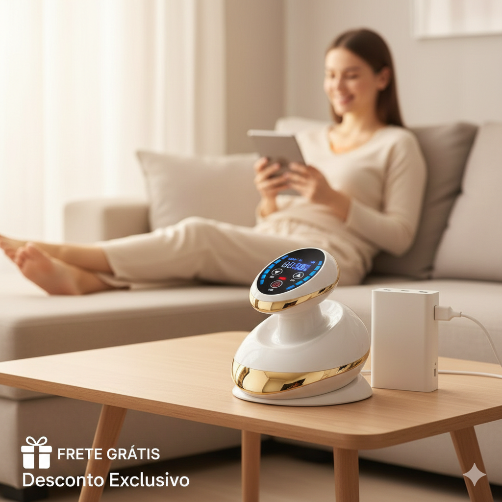O Sculpt Premium não é um massageador comum; é uma estação de tratamento corporal completa. Ele combina a milenar técnica Gua Sha com a moderna terapia de ventosaterapia elétrica para "sugar" as impurezas e ativar a circulação estagnada. Se você sofre com retenção de líquido, pernas pesadas ou aquela gordurinha insistente no abdômen, este dispositivo utiliza pressão negativa e calor infravermelho para quebrar as células de gordura e liberar o fluxo linfático, devolvendo a leveza e a definição ao seu corpo em minutos.